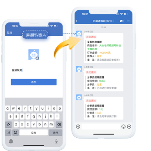 當買家完成付款、分享員申請加入、分享員申請提現傭金時,機器人都會在群里發送實時通知消息;