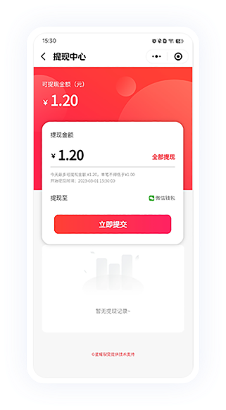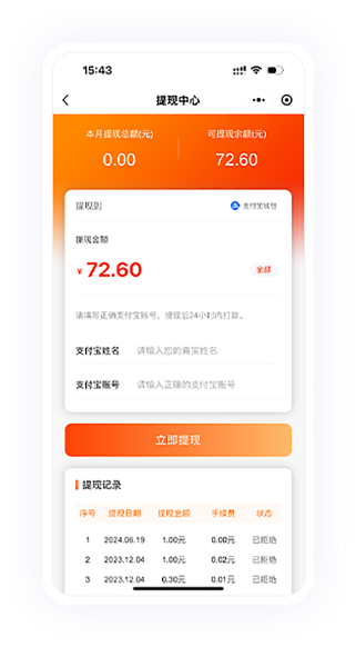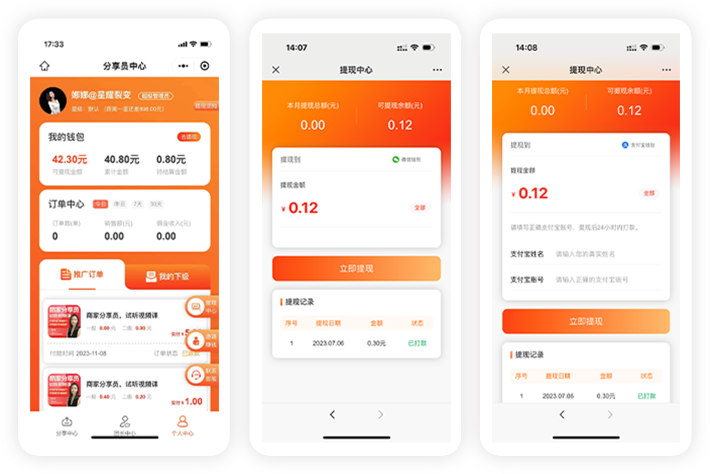 分享員的分銷訂單,系統自動統計傭金比例,分享員可實時查看自己的傭金,并通過微信/支付寶提現;
