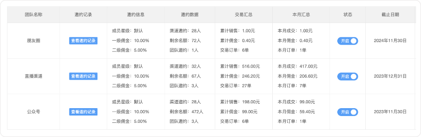 團長可實時查看團隊成員詳情數據、團隊成員推廣數據、團隊成員傭金數據等。