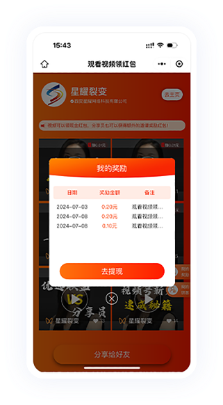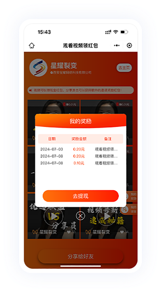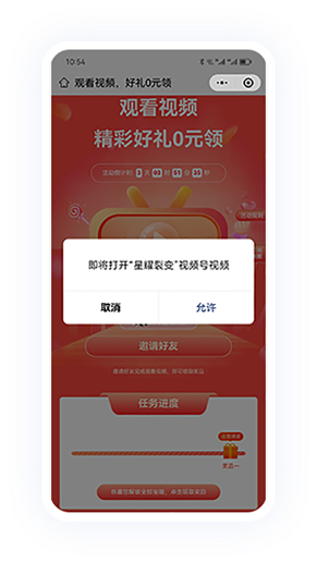 分享員邀請好友觀看短視頻,達到商家規定時長,分享員和好友都能得紅包獎勵,同時完成鎖客。