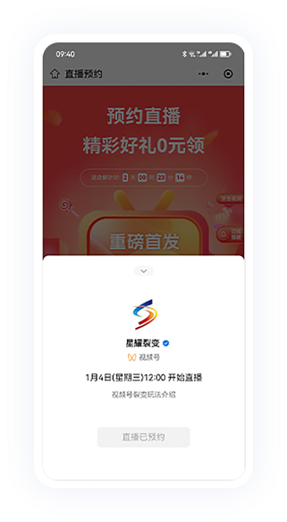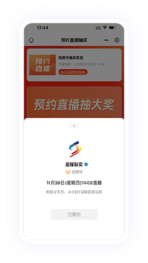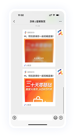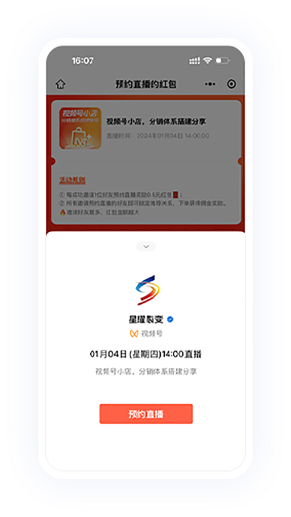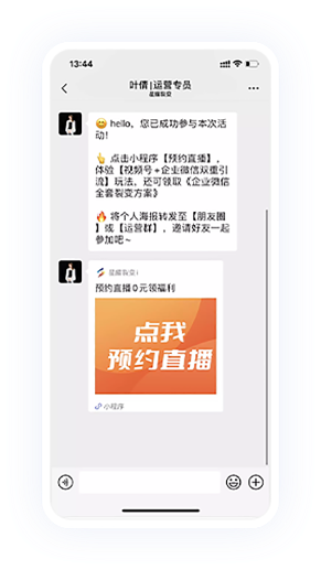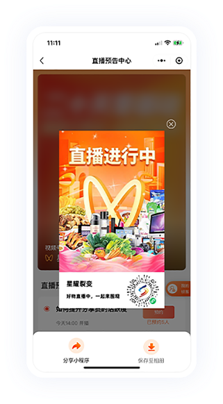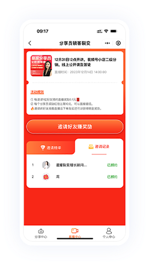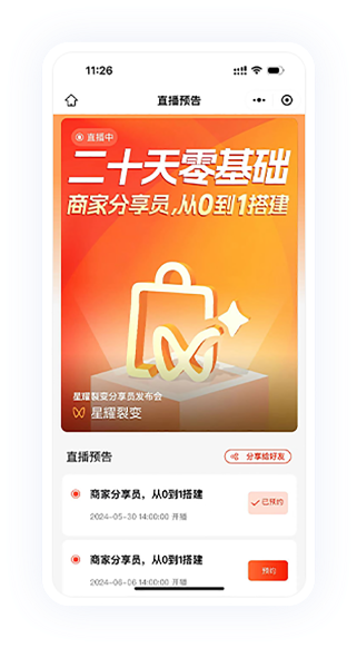 分享員分享預約直播鏈接,好友點擊預約,完成鎖客,同時好友還可申請成為分享員,幫助商家預約直播鎖客的同時,裂變更多的分享員