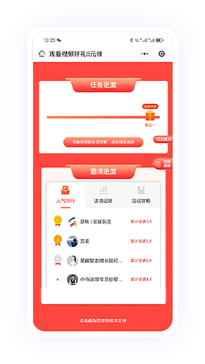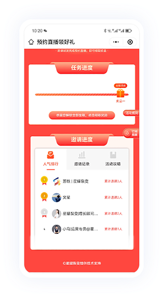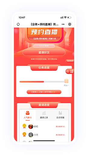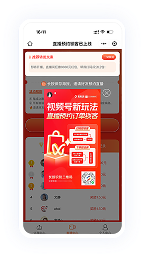 分享員自己觀看直播,或邀請好友觀看直播,達到一定時長得紅包獎勵,同時完成靜默鎖客